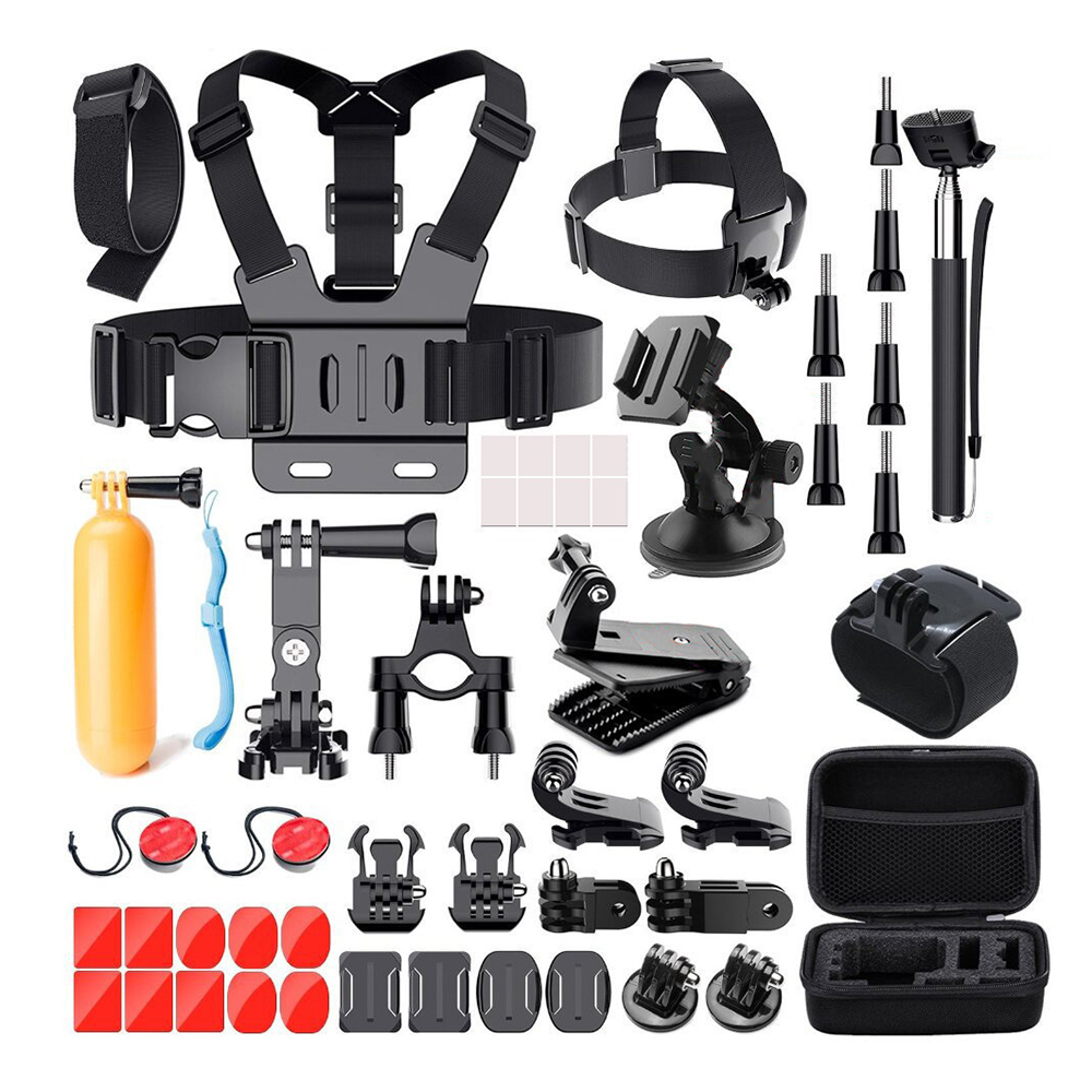 - В состав набора входитвыдвижная палка-монопод, держатель-поплавок с ремешком, нагрудное крепление, ремешок с плоским креплением на шлем, ремешок на запястье, манжета с креплением на запястье, 360° поворотный зажим с креплением, держатель на велосипед, 2 J-крепления «Крючок», сумка-чехол, 6 винтов, 8 противотуманных вставок, 10 наклееек для плоских и изогнутых креплений, мелкие крепления для перехода на штатив с резьбой, дополнительный болт и рычаг2 быстроразъемных пряжки, 4 плоских крепления